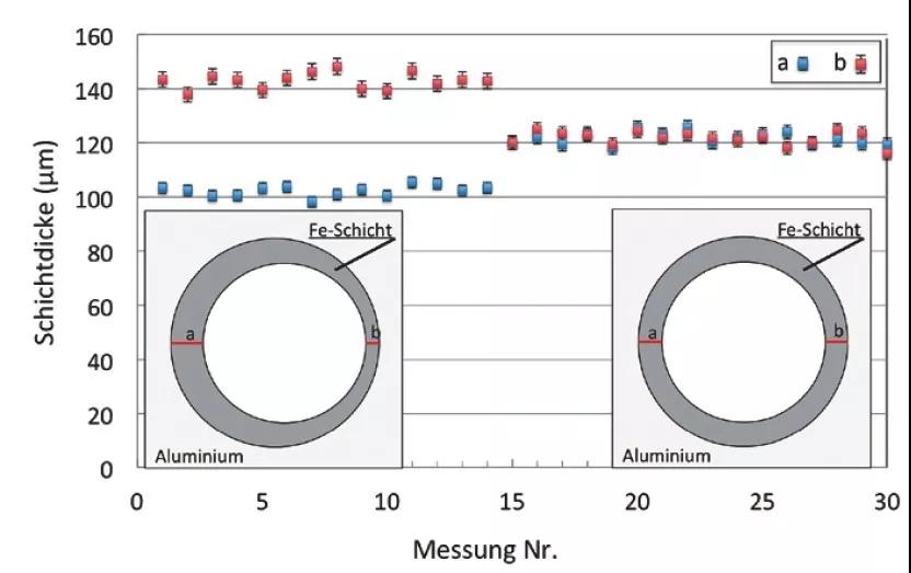 圖三 相對(duì)的點(diǎn)(a,b)處從底部到頂部測(cè)量油缸工作表面內(nèi)的涂層厚度。