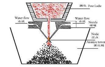直接擊碎液體金屬或合金而制得粉末的方法稱之為霧化法,是生產(chǎn)規(guī)模僅次于還原法的、應(yīng)用較廣泛的金屬粉末制取法。霧化粉末具有球形度高、粉末粒度可控、氧含量低、生產(chǎn)成本低以及適應(yīng)多種金屬粉末的生產(chǎn)等優(yōu)點(diǎn),已成為高性能及特種合金粉末制備技術(shù)的主要發(fā)展方向,但生產(chǎn)效率低,超細(xì)粉末的收得率不高,能耗相對(duì)較大等缺陷限制了霧化法的應(yīng)用。