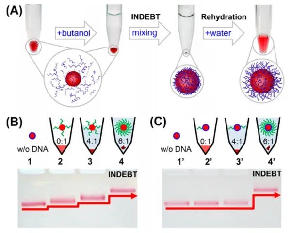 (B-C)凝膠電泳結(jié)果顯示,隨丁醇:H2O體積比增加,檸檬酸鹽(B)和磺化三苯基膦(C)保護(hù)的15 nm AuNP表面DNA修飾量先緩慢增加(B)或幾乎不變(C),發(fā)生脫水(INDEBT)時(shí)DNA接枝量急劇增加。