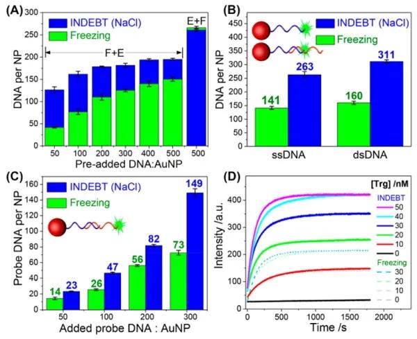 A-D)通過冷凍和INDEBT獲得的系列尺寸(5-45 nm AuNP,21-89b DNA)SNA的電泳圖和熒光DNA定量;