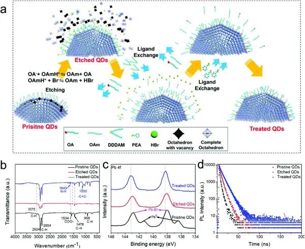 近日,北京科技大學(xué)田建軍教授(通訊作者)團(tuán)隊(duì)設(shè)計(jì)了一種新型的酸蝕驅(qū)動(dòng)的配體交換策略,獲得了超低缺陷態(tài)密度和高穩(wěn)定性的純藍(lán)光(465 nm)、小尺寸(≈4nm)CsPbBr3鈣鈦礦量子點(diǎn)(QDs)。該策略是先使用酸溴化氫(HBr)來蝕刻不完美的[PbBr6]4-八面體,從而去除表面缺陷和過多的羧酸鹽配體。再先后引入十二烷基胺和苯乙胺來鍵合QDs剩余未配位的位點(diǎn),并與原有長鏈有機(jī)配體進(jìn)行原位交換,從而達(dá)到97%的量子熒光產(chǎn)率,而且其穩(wěn)定性得到顯著提高?;谠換Ds的PeLEDs表現(xiàn)出純藍(lán)光的電致發(fā)光(470 nm)和EQE為4.7%。而且,其亮度為3850 cd m-2,這是迄今為止報(bào)道的純藍(lán)光PeLEDs的最高亮度。此外,該P(yáng)eLEDs還表現(xiàn)出強(qiáng)大的耐久性,在連續(xù)工作的情況下,半衰期超過12小時(shí),這也是藍(lán)光PeLEDs當(dāng)前報(bào)道的最高值。該成果以題為“Perovskite Quantum Dots with Ultralow Trap Density by Acid Etching-Driven Ligand Exchange for High Luminance and Stable Pure-Blue Light-Emitting Diodes”發(fā)表在了Adv. Mater.上。