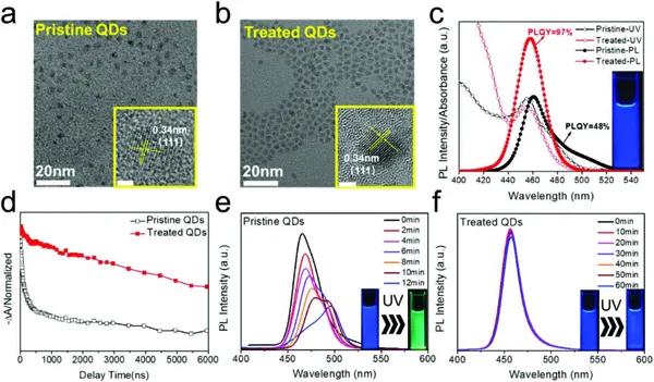 d)的瞬態(tài)吸收(TA,激發(fā)354 nm)漂白恢復(fù)曲線的演變,e)原始和f)處理的QDs在紫外線(UV)照射不同時(shí)間后的PL光譜。插圖:紫外線照射不同時(shí)間后的原始和經(jīng)過處理的量子點(diǎn)的照片。