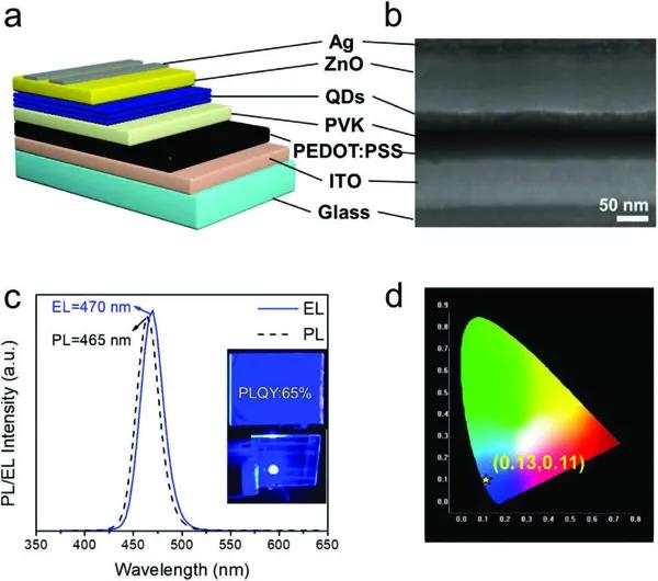c)QD薄膜的PL和PeLEDs的EL。