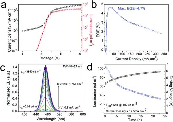 這項(xiàng)工作將酸蝕和配體交換結(jié)合起來,制備出高質(zhì)量的純藍(lán)色發(fā)光鈣鈦礦CsPbBr3 QDs。強(qiáng)酸性HBr蝕刻了具有空位缺陷的不完美八面體,并從QDs中去除多余的羧酸鹽配體。然后,通過短支鏈DDDAM鏈和PEA物種之間的配體交換過程,隨后與QDs表面形成強(qiáng)的L型配位作用。這一策略顯著提高了QDs的穩(wěn)定性,消除大量缺陷,獲得97%的量子熒光產(chǎn)率。基于該QDs的PeLEDs表現(xiàn)出純藍(lán)光發(fā)射(470nm)和4.7%的EQE,符合NTSC和Rec.2020標(biāo)準(zhǔn),是一種理想的藍(lán)光發(fā)射。3850cd m-2的亮度和12小時(shí)的半衰期也是迄今為止所報(bào)道的純藍(lán)光PeLEDs的最高亮度和穩(wěn)定性表現(xiàn)。因此,這一策略為推動(dòng)PeLEDs的發(fā)展和應(yīng)用提供了一種途徑。