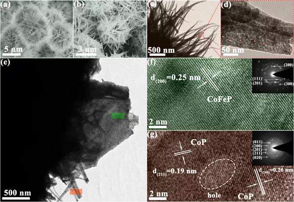 2D CoFeP 納米片/1D Fe-CoP 納米線(2D/1D CoFeP NSs@Fe-CoP NWs)主要制備過程如下:1. 通過水熱法制備前驅(qū)體:硝酸鈷(Co源),硝酸鐵(Fe源),尿素和氟化銨混合攪拌溶解。將混合溶液置入反應(yīng)釜中并在120°C的溫度下保持6h;2. 低溫磷化反應(yīng)生成2D/1D CoFePNSs@Fe-CoPNWs:將水熱反應(yīng)后的前驅(qū)體置入瓷舟內(nèi)并在氬氣氛圍下加熱并保持2h,待樣品冷卻至室溫,最終得到2D/1D CoFeP NSs@Fe-CoP NWs。圖2. 2D/1D CoFeP NSs@Fe-CoP NWs催化劑的微觀結(jié)構(gòu)表征