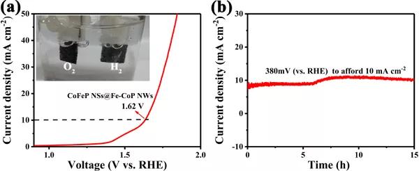 a)CoFeP NSs@Fe-CoP NWs樣品的極化曲線圖;b)CoFeP NSs@Fe-CoP NWs樣品在恒電位下的耐久性測(cè)試圖。該研究首次通過過飽和觸發(fā)維度和相控生長(zhǎng)策略構(gòu)建2D/1D CoFeP NSs@Fe-CoP NWs異質(zhì)結(jié)構(gòu),且此催化劑表現(xiàn)出優(yōu)越的HER,OER和全水解電催化性能。該合成策略能夠用于設(shè)計(jì)具有優(yōu)異的多功能電催化性能的2D/1D磷化物異質(zhì)結(jié)構(gòu)催化劑,也將為推進(jìn)能源相關(guān)應(yīng)用的多維納米結(jié)構(gòu)開辟另一種途徑。