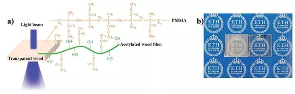 圖2 (a)改性高透明木材結(jié)構(gòu)的示意圖;(b)非乙?;该髂静?左)和乙酰化透明木材(右)。