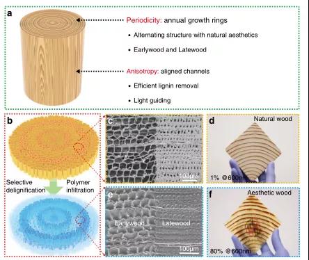 圖3 美觀木材的制作、微觀結(jié)構(gòu)和外觀。