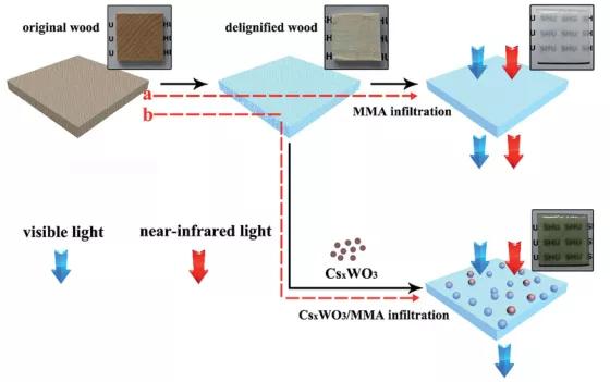 上海大學(xué)Yanfeng Gao團(tuán)隊(duì)將納米粒子分散在預(yù)聚合的甲基丙烯酸甲酯中,然后填充到脫木質(zhì)素木材的納米孔中,制備透明木材。該木質(zhì)復(fù)合材料表現(xiàn)出優(yōu)異的近紅外(NIR,范圍從780到2500 nm)屏蔽能力和高可見(jiàn)光透明度。CsxWO3/透明木材也表現(xiàn)出優(yōu)異的機(jī)械性能,斷裂強(qiáng)度高達(dá)59.8 MPa,模量高達(dá)2.72 GPa。CsxWO3/透明木材有望成為智能窗應(yīng)用的潛在材料。