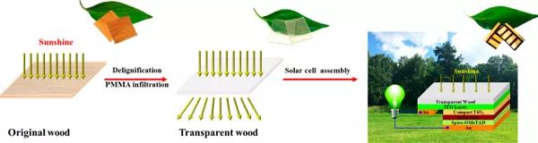 由于其低密度(ca. 1.2 g cm-3)、高透光率(1 mm厚時(shí)超過(guò)85%)、低熱導(dǎo)率(0.23 W m?K?1)、良好的承重性能和堅(jiān)韌的失效行為(無(wú)碎裂),透明木材成為節(jié)能建筑材料的候選材料。高透光率也使透明木材成為光電器件的候選材料。在這項(xiàng)工作中,瑞典皇家理工學(xué)院Yuanyuan Li和Licheng Sun合作,首次成功地將低溫(< 150℃)處理的鈣鈦礦太陽(yáng)能電池,直接組裝在透明的木質(zhì)基底上,獲得高達(dá)16.8%的功率轉(zhuǎn)換效率。該技術(shù)可為太陽(yáng)能電池與透光木結(jié)構(gòu)建筑的集成鋪平道路,以達(dá)到節(jié)能的目的。