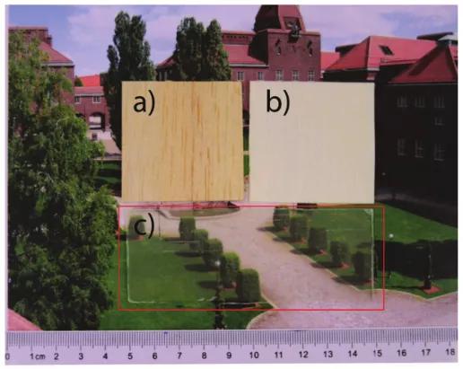 圖10 (a)化學(xué)處理前的輕木照片;(b)脫木質(zhì)素的木材;(c)透明木材(沒(méi)有染料分子嵌入)。