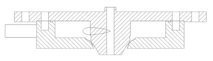 本文設(shè)計(jì)了一種結(jié)構(gòu)簡單的霧化噴嘴, 噴嘴輪廓采用典型的拉瓦爾曲線, 可以在氣體壓力較低的情況下獲得超音速氣流。通過計(jì)算模擬 ,調(diào)節(jié)至最佳的結(jié)構(gòu)參數(shù), 采用有機(jī)玻璃作為主體材料, 考慮到經(jīng)濟(jì)性和加工方便, 采用環(huán)縫型的拉瓦爾噴嘴, 噴嘴的結(jié)構(gòu)如圖 1 所示。采用水代替金屬熔體, 氮?dú)庾鳛殪F化氣體, 在常溫條件下模擬真實(shí)情況下的氣霧化過程。通過 Fluent 軟件的計(jì)算模擬, 可以得到最佳結(jié)構(gòu)參數(shù)下, 霧化過程中流場、 溫度場等的分布情況,如圖2 所示。通過模擬實(shí)驗(yàn)的方法, 可以驗(yàn)證模擬結(jié)果的合理性。
