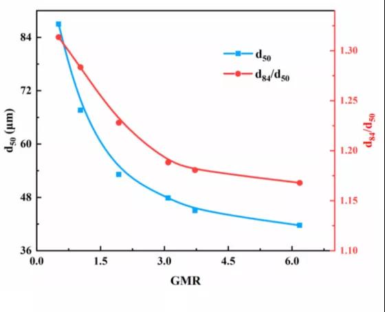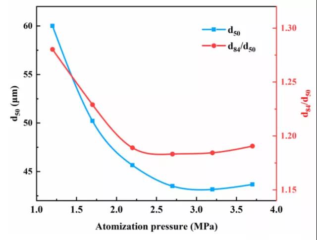 Lubanska研究了一種低熔點(diǎn)鐵合金的霧化工藝參數(shù)與粉末粒度之間的關(guān)系后總結(jié)出一個經(jīng)驗(yàn)公式: