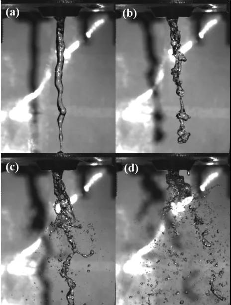 高速攝影拍攝的結(jié)果可保存為視頻文件,利用 Adobe Premiere Pro 軟件,可將視頻中每一幀圖像提取出來,選擇其中典型的霧化圖像可以對霧化過程進(jìn)行分析。以氣體壓力為1.7MPa, 液體流量為 60L/h 為例, 提取出一系列圖片, 如圖 4所示。