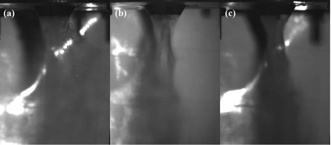 在霧化氣體壓力達(dá)到預(yù)定值并穩(wěn)定后, 形成的霧化流場也會變得穩(wěn)定, 液體破碎的機(jī)理和程度都不隨時(shí)間改變。如圖 5 所示, 為不同霧化氣體壓力下, 霧化流場穩(wěn)定后的圖像。圖 5 中的 (a)、(b)、 (c) 分別為霧化氣體壓力為 1.7MPa、 2.2MPa、2.7MPa 時(shí)的霧化流場圖像。