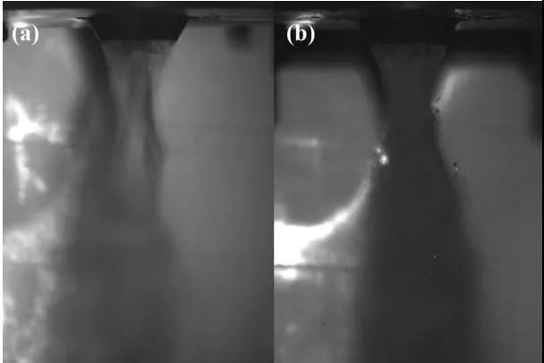 圖 7 不同液體流量時(shí)的霧化流場圖像:(a) Q=60L/h; (b)Q=120L/h