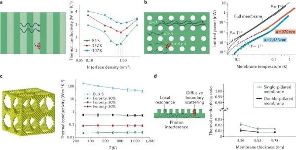 (a)一維超晶格中的相干(波浪線)和擴(kuò)散(直線)聲子散射(左)。(b)二維納米聲子晶體(NPC)中聲子輸運(yùn)的三種可能機(jī)制是由聲子波長(zhǎng)λ、聲子平均自由路徑Λ和NPC周期d(左)之間的關(guān)系決定的。(c)三維NPC以及具有不同孔隙率的三維NPC和體硅的熱導(dǎo)率隨溫度的變化。(d)柱狀結(jié)構(gòu)導(dǎo)熱系數(shù)降低的三種機(jī)制示意圖,雙柱撐膜(兩側(cè)有柱)和單柱撐膜(僅一側(cè)有柱)的導(dǎo)熱系數(shù)比相同厚度的均勻膜低兩個(gè)數(shù)量級(jí)。
