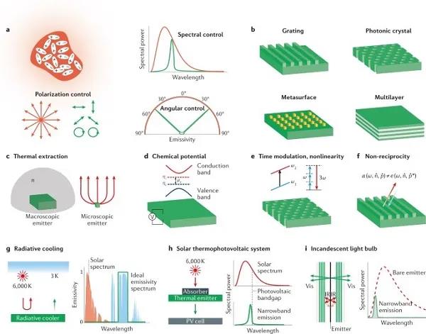 (a)傳統(tǒng)的黑體熱輻射(橙色)和納米結(jié)構(gòu)控制的熱輻射(綠色)。(b)用于熱輻射控制的納米結(jié)構(gòu),包括光子晶體、光柵、超材料和多層膜。(c)超越普朗克定律:在宏觀發(fā)射器和微觀熱天線中通過(guò)熱提取增強(qiáng)吸收截面。(d)在具有非零化學(xué)勢(shì)μγ的半導(dǎo)體中,通過(guò)分離電子ηc和空穴ηv的準(zhǔn)費(fèi)米能級(jí),可以獲得非平衡熱輻射。(e)非平衡熱輻射可以通過(guò)時(shí)間調(diào)制引起的頻率躍遷和非線性來(lái)實(shí)現(xiàn)。(f)超越基爾霍夫定律:非互易熱輻射。在非互易系統(tǒng)中,角光譜吸收率α和發(fā)射率ε之間的平衡可能被打破。(g)白天輻射冷卻可以使用在整個(gè)太陽(yáng)光譜上吸收率接近零的材料,并且在8-13 μm光譜范圍內(nèi)具有強(qiáng)發(fā)射率。(h)太陽(yáng)能熱光伏系統(tǒng):一個(gè)中間元件吸收入射的陽(yáng)光加熱,然后根據(jù)太陽(yáng)能電池的帶隙產(chǎn)生熱輻射。(i)超越基爾霍夫定律:非互易熱輻射。在非互易系統(tǒng)中,角光譜吸收率α和發(fā)射率ε之間的平衡可能被打破。