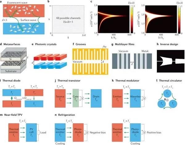 (a)跨度為d或小于峰值熱波長(zhǎng)λ的真空間隙的近場(chǎng)輻射傳熱示意圖。(b)在頻率-波矢(ω-k)空間上所有可能通道的近場(chǎng)輻射傳熱的理論極限。(c)一對(duì)間隔為10 nm的SiC平板之間的光子傳輸概率ξ(ω,k)的圖。(d-h)增強(qiáng)近場(chǎng)輻射傳熱的平臺(tái)包括超表面、光子晶體、溝槽、多層膜和通過(guò)逆向設(shè)計(jì)獲得的結(jié)構(gòu)。(i-n)近場(chǎng)傳熱器件的概念包括熱二極管、熱晶體管、熱調(diào)制器、熱循環(huán)器、近場(chǎng)熱光伏、器件和近場(chǎng)正、負(fù)發(fā)光冰箱。