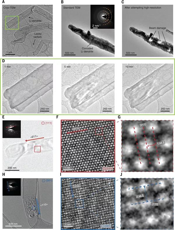 低溫轉(zhuǎn)移過程中成功地保存了枝晶,與低溫轉(zhuǎn)移的樣品相反,在室溫下插入TEM中的Li金屬被迅速消耗掉(圖3B)。這些暴露在空氣中的Li枝晶的表面比低溫轉(zhuǎn)移的Li枝晶更粗糙,對比度也更暗,這是因?yàn)樾纬闪硕嗑蜗?,選定區(qū)域電子衍射表明存在氫氧化鋰。此外,任何嘗用標(biāo)準(zhǔn)TEM在高分辨率下對鋰金屬枝晶成像的嘗試都會導(dǎo)致樣品破壞(圖3C)。在低溫條件下,在恒定電子束輻照下,即使在10分鐘后,也未檢測到枝晶形態(tài)的損壞。低溫下鋰枝晶的高分辨率圖像(圖3F,I)可分辨單個鋰原子,表明鋰枝晶是單晶的。