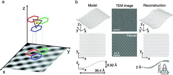 單獨(dú)的石墨烯不是完美的二維晶體,而具有波紋的三維結(jié)構(gòu)。理論計(jì)算表明,波紋強(qiáng)烈影響石墨烯的各種基本理化性質(zhì),因此在實(shí)驗(yàn)中定量闡明波紋結(jié)構(gòu)非常重要。Yuhiro等人用像差校正的透射電子顯微鏡(ACTEM)測量了波紋的3D原子結(jié)構(gòu)。該方法利用以下事實(shí):TEM圖像的2D對比度對六元環(huán)的高度敏感。將該方法實(shí)驗(yàn)性地應(yīng)用于單層石墨烯,并重建了連續(xù)獲取的TEM圖像的3D原子排列。