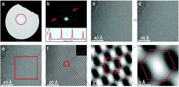 圖5. TEM和圖像(h)紅色虛線表示六元環(huán),其最近鄰原子距離為1.42。兩側(cè)相交處有一個碳原子