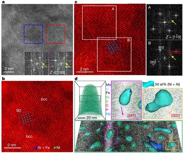 圖6 高分辨HADDF TEM和重構(gòu)的三維原子探針資料表明析出的B2相粒子與基體完全共格