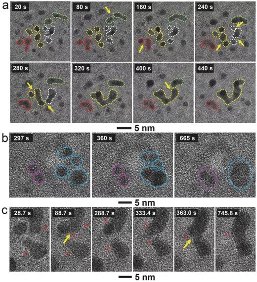 圖7 鉑納米線生長過程的原位電鏡圖:a Pt納米線不同階段的生長過程;b Pt形核之后的初始生長過程;c Pt短鏈形成過程中Pt顆粒的旋轉(zhuǎn)、接觸和連接細(xì)節(jié)。