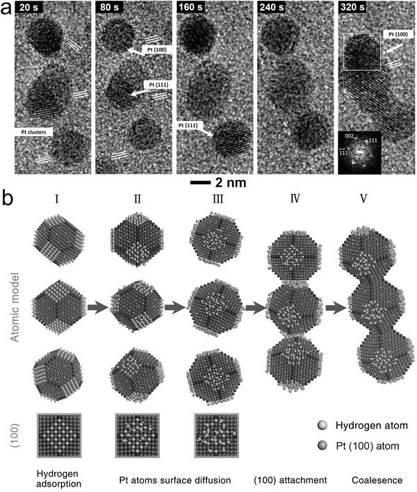 圖8 鉑納米線形成過程中的定向連接及原子模型:a 原位電鏡下Pt納米顆粒在Pt(100)晶面的定向連接過程;b Pt納米顆粒定向連接初始階段的原子模型示意圖,包括:氫吸附,Pt納米顆粒晶面上的擴(kuò)散增強(qiáng),Pt(100)晶面上的定向接觸、連接過程。