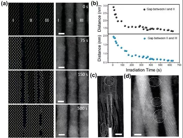 圖9 Ag在組裝納米線之間的遷移過程:a遷移過程中Te納米線之間的結(jié)構(gòu)變化;b納米線間距變化;(c-d)納米線遷移中間態(tài)連接橋。