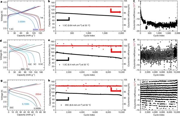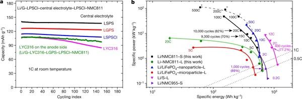 今日,在哈佛大學(xué)李鑫教授(通訊作者)團(tuán)隊(duì)帶領(lǐng)下,報(bào)告了一種界面穩(wěn)定性(對鋰金屬響應(yīng))分層結(jié)構(gòu)的固態(tài)電池設(shè)計(jì),實(shí)現(xiàn)無鋰枝晶穿透的超高電流密度。多層設(shè)計(jì)將較不穩(wěn)定的電解質(zhì)夾在較穩(wěn)定的固體電解質(zhì)之間,通過在較不穩(wěn)定的電解質(zhì)層中局部分解,阻止了任何鋰枝晶的生長。團(tuán)隊(duì)提出了一種類似于膨脹螺絲效應(yīng)的機(jī)制,即任何裂縫都被動(dòng)態(tài)生成的分解物所填充,而這些分解也受到很好的約束,可能是由分解引起的“錨定”效應(yīng)。鋰金屬負(fù)極與LiNi0.8Mn0.1Co0.1O2正極配對的循環(huán)性能非常穩(wěn)定,在20 C倍率下進(jìn)行10000次循環(huán)后,容量保持率為82%(8.6 mA/cm2),在1.5C倍率下進(jìn)行2000次循環(huán)后容量保持率為81.3%(0.64 mA/cm2)。同時(shí),在微米級正極材料水平還能實(shí)現(xiàn)110.6 kW/kg的比功率和631.1 Wh/kg的比能量。相關(guān)成果以題為“A dynamic stability design strategy for lithium metal solid state batteries”發(fā)表在了Nature。