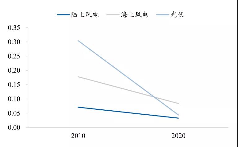 根據IRENA的統(tǒng)計,過去十年間中國陸上/海上風電的平均度電成本分別由2010年的0.071/0.178美元降至2020年的0.033/0.084美元,下降幅度為54%/53%,明顯低于同期國內光伏度電成本的下降幅度86%。