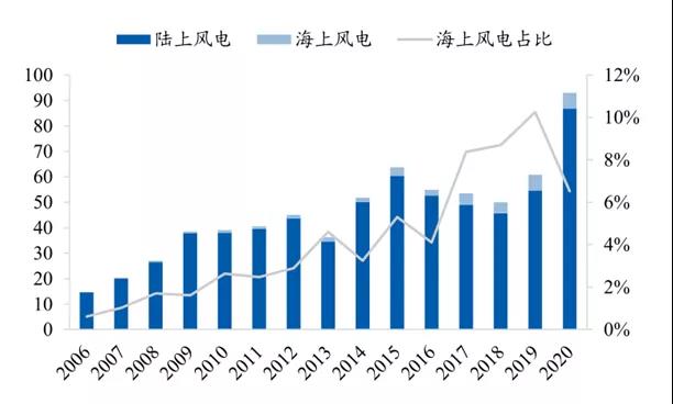 事實上,從全球范圍來看,現階段海上風電整體處于發(fā)展初級階段。根據全球風能理事會的統(tǒng)計,截至2020年全球海上風電累計裝機規(guī)模為35GW,在總裝機中的占比僅為6%。