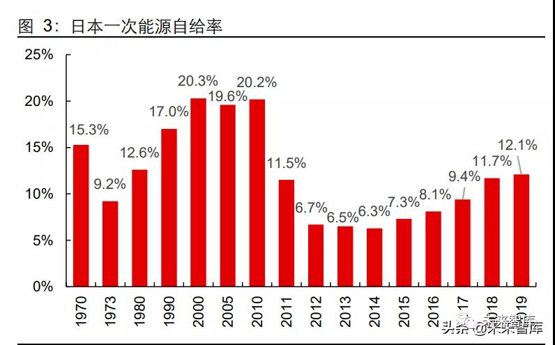 能源安全+減排降碳壓力下,日本大力發(fā)展氫能。日本國土面積狹小、自然資源匱乏, 能源對外依賴程度較高。石油、煤炭、天然氣為日本的主要一次能源來源,其中石油為 第一大能源,但 1973 年石油危機爆發(fā)導致油價暴漲和石油斷供風險加大,日本為降低 對石油的依賴程度,引入核能、煤炭、天然氣等作為石油的替代能源,石油在日本的能 源供給比例從 1970s 的 70%以上降低至目前的 40%以下,煤炭和天然氣的供給比例持 續(xù)上升。值得一提的是,2011 年福島核事故導致日本的核能發(fā)展受阻,核能供給比例在 2011 年迎來斷崖式下降,目前仍處于較低位置。受此影響,日本的一次能源自給率從 2010 年的 20.2%高位降低至 2011 年的 11.5%,并在 2014 年進一步降低至 6.3%的歷 史低位。同時,日本還面臨著 2050 年實現碳中和、2030 年溫室氣體排放量較 2013 年 降低 46%的減排壓力。尋找安全可靠清潔的替代能源,成為日本的當務之急;清潔、高 效、靈活的氫能成為日本的重要選擇。