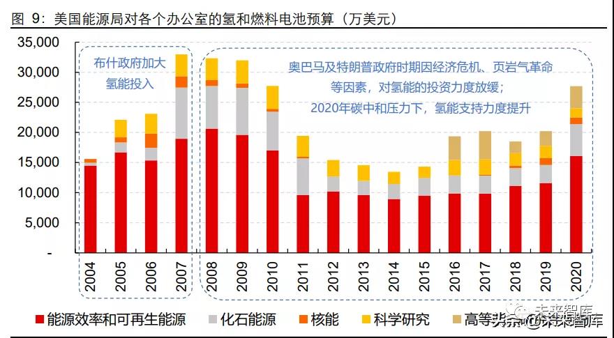 氫能的發(fā)展離不開政府的財政支持,美國能源部主要通過“氫能規(guī)劃”(DOE Hydrogen Program)實現對氫和燃料電池技術的研究和應用,規(guī)劃制定了從研發(fā)到產業(yè)化的計劃 路線,跨越 2000~2040 年。2004-2020 年美國能源部對氫和燃料電池的預算支出金額 合計約 37 億美元,年均支出 2.2 億美元;其中 2008 年奧巴馬政府上臺后,受經濟危機 和頁巖氣革命爆發(fā)影響,政府氫能預算支出減少;特朗普政府時期也更加重視傳統(tǒng)能源 的發(fā)展;而 2020 年美國新版國家氫能戰(zhàn)略發(fā)布及碳中和壓力下,氫能的預算支出同比 增加 37%至 2.77 億美元。