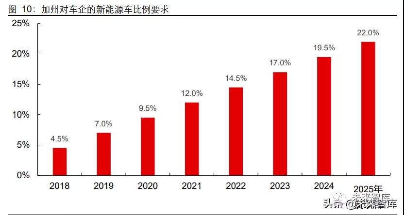 (2)政策法案:加州空氣資源委員會(CARB)于 1990 年首次采用 ZEV 法規(guī)(Zero Emission Vehicle,縮寫 ZEV),ZEV 目的是通過要求汽車制造商銷售一定數量的清潔 能源汽車來實現長期減排目標,其中清潔能源汽車包括純電動汽車、插電混合式汽車、 燃料電池汽車等;最新政策規(guī)定,該比例從 2018 年的 4.5%提升至 2025 年的 22.0%;不同車型對應不同的積分,車輛在零排放的狀態(tài)下續(xù)航里程越長,可獲得的積分越高。2013 年 9 月,加州第 8 號議會法案(AB 8)審批通過,該法案確立了空氣質量補貼項 目、替代和可再生燃料及車輛技術項目等;同時,還規(guī)定加州能源委員會每年投入 2000 萬美元資金來支持至少 100 個加氫站的持續(xù)建設;另外,該法案要求加州空氣資源委員 會每年針對燃料電池汽車部署和加氫站網絡發(fā)展做出年度報告。