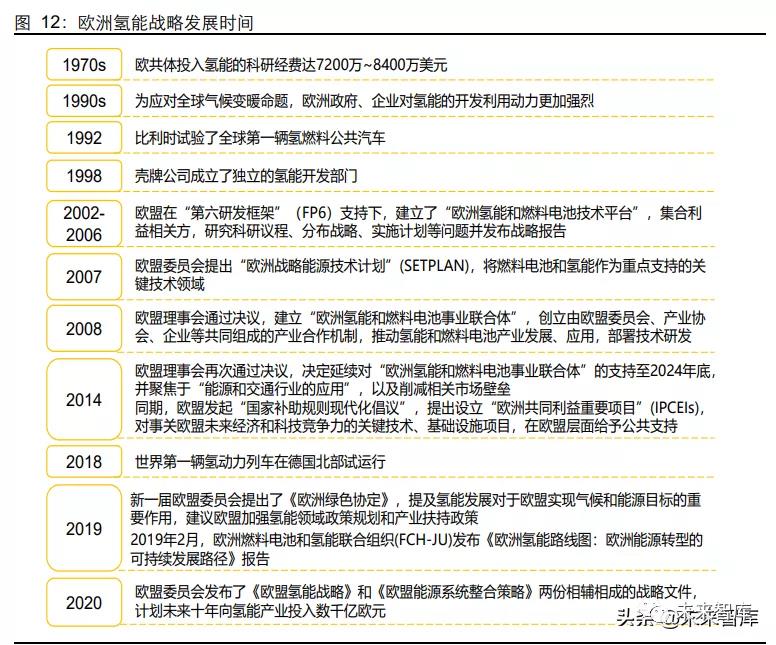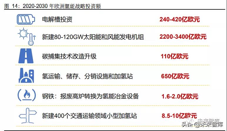歐洲大力發(fā)展氫能的動力,同樣來自全球石油危機后對能源安全的追求,及全球氣候變 暖背景下的降碳壓力。2020 年歐盟委員會發(fā)布了《歐盟氫能戰(zhàn)略》和《歐盟能源系統(tǒng)整 合策略》兩份相輔相成的戰(zhàn)略文件,計劃未來十年向氫能產業(yè)投入數千億歐元。從歐盟 的規(guī)劃可以看出,基于風電和光伏等可再生能源的綠氫為其重點鼓勵和發(fā)展方向;氫能 戰(zhàn)略的投資計劃涵蓋制氫、儲運氫、加氫的全產業(yè)鏈,以及碳捕集技術升級改造、氫能 煉鋼等,預計總投資規(guī)模約 3200-4600 億歐元。(報告來源:未來智庫)