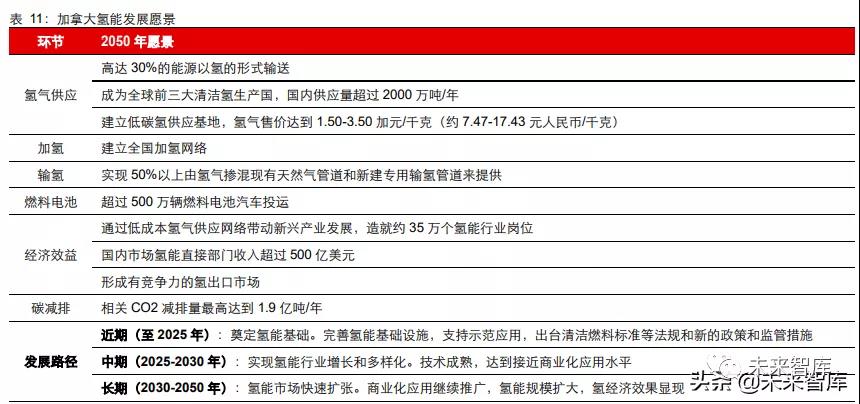2020 年 12 月加拿大發(fā)布國家氫能戰(zhàn)略,目標通過加強氫能基礎設施建設及促進終端應 用,降低氫能使用成本,降低國家碳排放量,同時成為全球主要氫能供應國。加拿大目 標到 2050 年實現國內氫供應量超過 2000 萬噸/年,氫氣售價降低至 1.50-3.50 加元/千 克(約 7.47-17.43 元人民幣/千克);建立全國加氫網絡;實現 50%以上氫氣由現有天然 氣管道或新建專用儲氫管道提供;投運超過 500 萬輛燃料電池汽車。