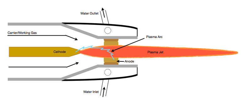 大氣等離子噴涂(APS)是應(yīng)用最早、最廣的一種熱噴涂技術(shù),整個(gè)噴涂過(guò)程在大氣環(huán)境下進(jìn)行。APS通常利用Ar、N2和He作為工作介質(zhì),其核心部件是等離子噴槍?zhuān)ぷ髟硎窃陉?yáng)極和陰極之間通入上述工作氣體作為介質(zhì),使其電離并產(chǎn)生等離子弧,通過(guò)等離子弧的作用進(jìn)一步將噴涂材料加熱至熔融或半熔融狀態(tài)后進(jìn)行噴涂。