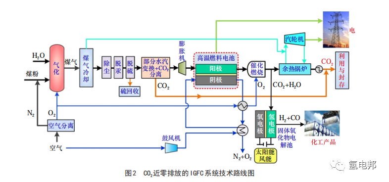 在固體氧化物燃料電池技術(shù)應(yīng)用場(chǎng)景方面,IGFC 技術(shù)有助于實(shí)現(xiàn)煤炭的清潔高效利用,是煤炭領(lǐng)域的變革性技術(shù)。為推進(jìn)IGFC相關(guān)技術(shù)攻關(guān)和工程示范,科學(xué)技術(shù)部在2017年立項(xiàng)了國(guó)家重點(diǎn)研發(fā)計(jì)劃 “CO2近零排放的煤氣化發(fā)電技術(shù)”,由國(guó)家能源集團(tuán)牽頭,聯(lián)合中國(guó)礦業(yè)大學(xué)(北京)、中國(guó)華能集團(tuán)清潔能源技術(shù)研究院有限公司、清華大學(xué)等單位組成“產(chǎn)學(xué)研”攻關(guān)團(tuán)隊(duì),其核心任務(wù)是開(kāi)發(fā)高溫固體氧化物燃料電池和固體氧化物電解池技術(shù),建成 CO2近零排放的 IGFC 示范工程,項(xiàng)目總體技術(shù)路線如圖2所示。IGFC系統(tǒng)一般由煤氣化凈化、高溫燃料電池發(fā)電、余熱回收及CO2捕集和封存等子系統(tǒng)構(gòu)成,其中高溫燃料電池發(fā)電技術(shù)是制約IGFC發(fā)展的關(guān)鍵技術(shù)。項(xiàng)目組目前已開(kāi)發(fā)了固體氧化物燃料電池電堆和IGFC測(cè)試平臺(tái),已實(shí)現(xiàn)了20千瓦級(jí)IGFC發(fā)電系統(tǒng)試車(chē),下一步將依托已有技術(shù)開(kāi)展100千瓦級(jí)IGFC發(fā)電系統(tǒng)示范 [12]。目前,國(guó)內(nèi)IGFC仍處于起步階段,煤氣凈化提純技術(shù)、高溫燃料電池技術(shù)、系統(tǒng)耦合控制技術(shù)等相關(guān)技術(shù)研究正逐步開(kāi)展。高溫固體氧化物燃料電池技術(shù)是制約IGFC發(fā)展的關(guān)鍵技術(shù),目前,國(guó)內(nèi)的固體氧化物燃料電池技術(shù)尚未完全成熟,一方面應(yīng)加強(qiáng)基礎(chǔ)研究,另一方面要重點(diǎn)開(kāi)展關(guān)鍵技術(shù)攻關(guān),降低成本,提高壽命。