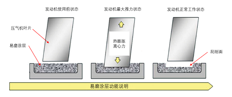 易磨涂層(Abradable Coating),是發(fā)動(dòng)機(jī)葉尖封嚴(yán)系統(tǒng)的一部分,也叫“封嚴(yán)涂層”。通常應(yīng)用于機(jī)匣零件中的跑道面,主要作用是減少葉尖碰磨損傷。由于易磨涂層需要跟葉尖進(jìn)行對(duì)磨,為了保護(hù)葉尖,易磨涂層一般硬度小,結(jié)合力差,從而能夠保證葉尖在大服役狀態(tài)碰上時(shí),能夠有效地刮削涂層。