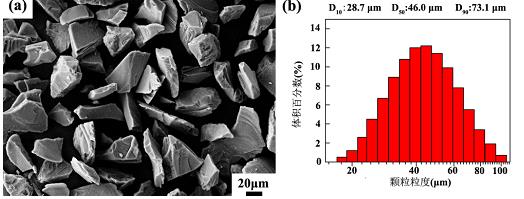 圖 1 Si 粉的顯微形貌和激光粒度分布:(a) 掃描形貌;(b) 激光粒度分布