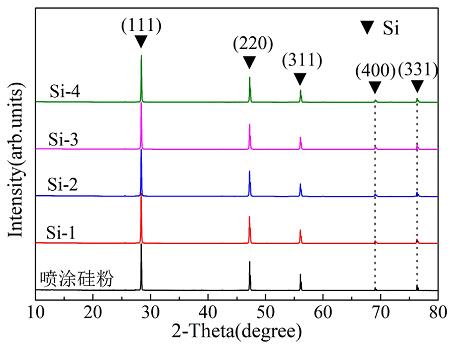 對四組工藝制備的 Si 粘結(jié)層和噴涂硅粉的相組成進(jìn)行了 XRD 分析, 結(jié)果如圖 3 所示。對比涂層和噴涂硅粉圖譜, 可以看出噴涂態(tài)涂層與噴涂硅粉的 X 射線衍射峰峰位沒有出現(xiàn)漂移, 相組成相同, 說明在 Si 粘結(jié)層制備過程中沒有出現(xiàn)雜質(zhì)相。