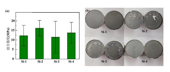 圖 7 Si 粘結(jié)層結(jié)合強(qiáng)度實(shí)驗(yàn)結(jié)果:(a) 涂層結(jié)合強(qiáng)度柱狀圖;(b) 拉脫典型形貌圖片