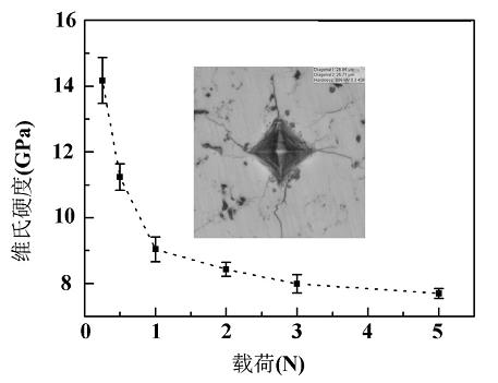 基于前面幾部分對 Si 粘結(jié)層涂層相組成、 形貌和結(jié)合強(qiáng)度分析, 涂層表面粗糙度、 粉體的熔融情況、 涂層表面的氧含量和孔隙率都隨噴涂電流有規(guī)律的變化, 但是 Si-2 組(噴涂電流為 400 A)涂層結(jié)合強(qiáng)度高于其他三組工藝。對 Si-2 組的涂層表面進(jìn)行拋光, 采用全自動(dòng)硬度計(jì)進(jìn)行硬度測量, 載荷分別為 25 g、 50 g、 100 g、 200 g、 300 g和 500 g, 基于測量的數(shù)據(jù)繪制了不同載荷下硬度對比圖, 將對應(yīng)的硬度平均值用虛線連接, 形成