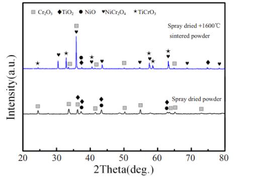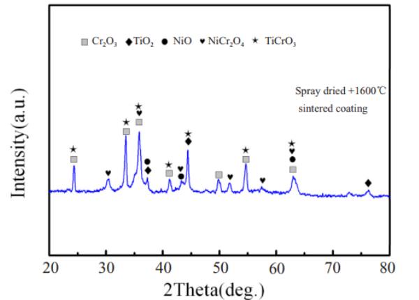 圖 4 為 Cr2O3-TiO2 復合粉末燒結前后 XRD 圖譜分析。從圖中可以看出, 復合粉末燒結前, 原始粉末獨立存在, 未發(fā)生化學反應。1600 ℃燒結3 h 后, Cr2O3、 TiO2 和 NiO 衍射峰有所降低, 同時出現 NiCr2O4 尖晶石相和 TiCrO3 鈣鈦礦結構相。這表明, 原始粉末在燒結過程中發(fā)生化學反應形成新的化合物, 從而使復合粉末不再簡單地依靠粘結劑物理結合, 而形成化學結合, 提高了粉末的團聚效果。同時, NiCr2O4 尖晶石相的出現, 有利于提高涂層的發(fā)射率。
