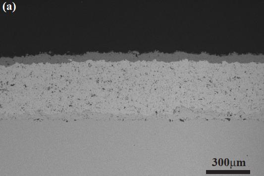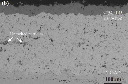 圖 5 Cr2O3-TiO2/nano-YSZ 復合涂層截面形貌:(a) 低倍;(b) 高倍