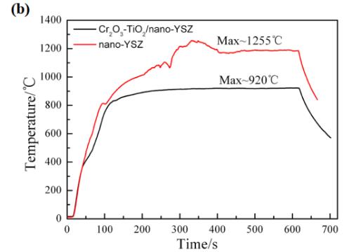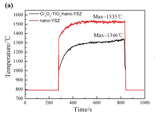 圖 9 Cr2O3-TiO2/nano-YSZ 復合涂層和納米 YSZ 涂層燒蝕過程中:(a) 表面溫度曲線;(b) 背部溫度曲線