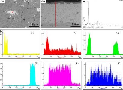圖 10 Cr2O3-TiO2/nano-YSZ 復合涂層燒蝕后: (a) 表面形貌; (b) 截面形貌; (c) 點掃描; (d) 線掃描