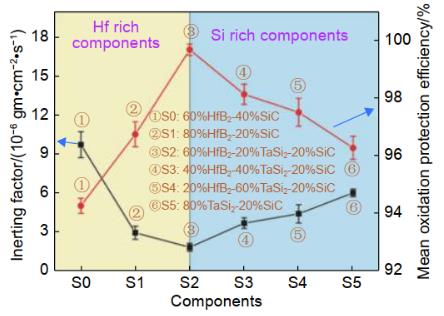 圖 6 HfB2-SiC-TaSi2 涂層試樣的惰性因子和平均抗氧化效率曲線(xiàn)